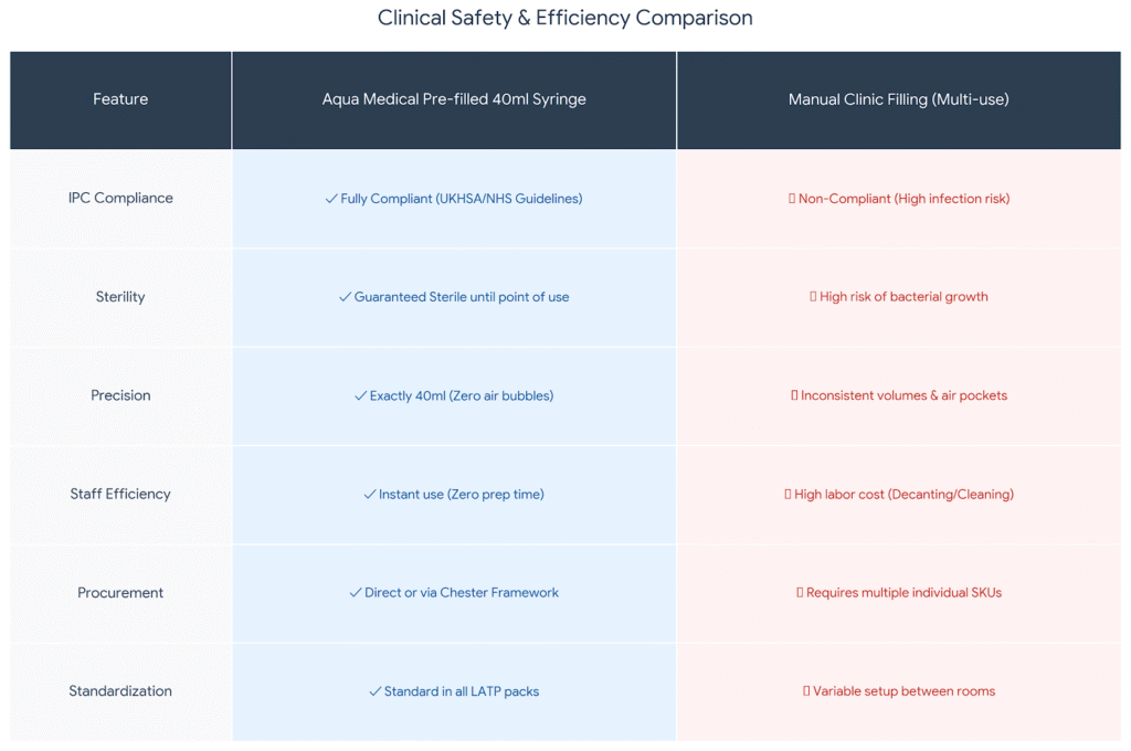 Why Switch? Manual filling in the clinic isn’t just a time-sink—it’s a clinical risk. By choosing Aqua Medical’s pre-filled syringes, you align your department with the highest national IPC standards and safeguard your patients against healthcare-associated infections.